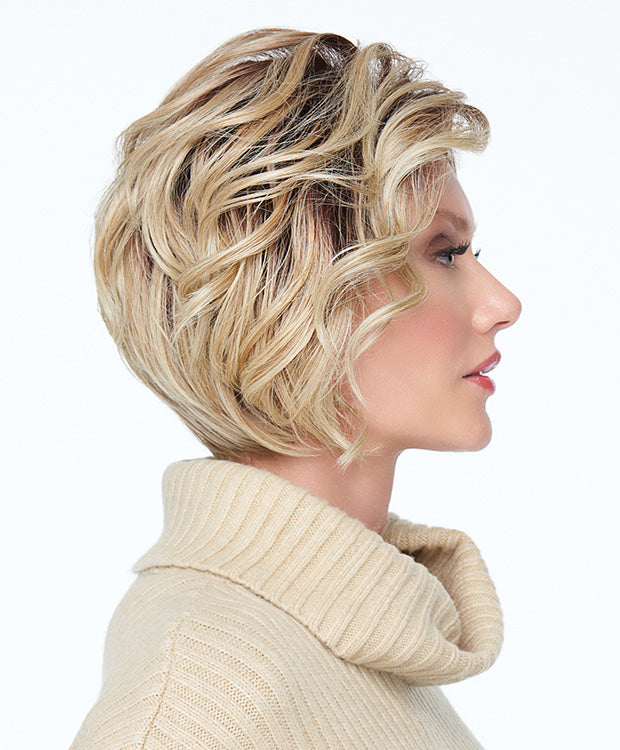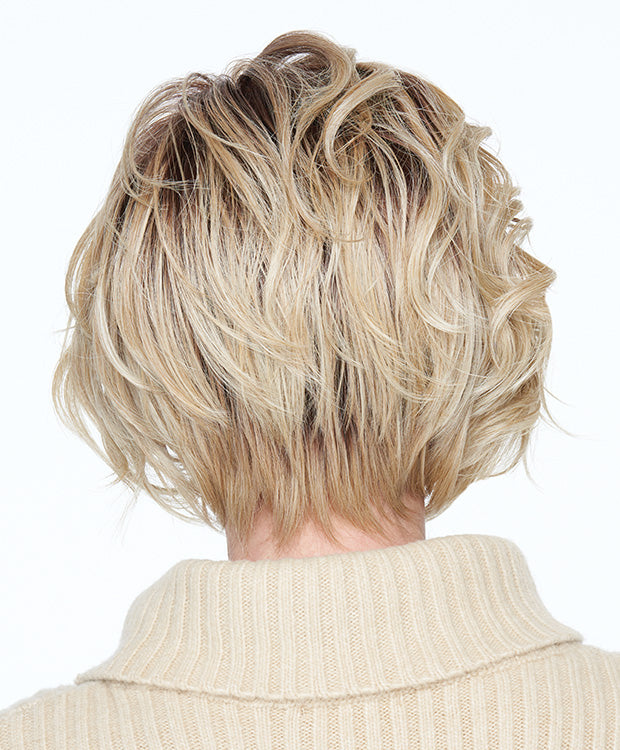 Bring the page into the age of glamour! Tousled and tumbled curled lengths fall gracefully around the cheeks and chin, and combine with the elegantly sculpted nape to create a fresh, sophisticated silhouette. The temple-to-temple lace front allows for off-the-face styling while the monofilament part can be sharply drawn or styled undone with ease.