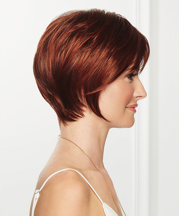 The perfect balance of modern and classic with a side-swept bang, face-framing layers, sculpted nape and lace front monofilament part.