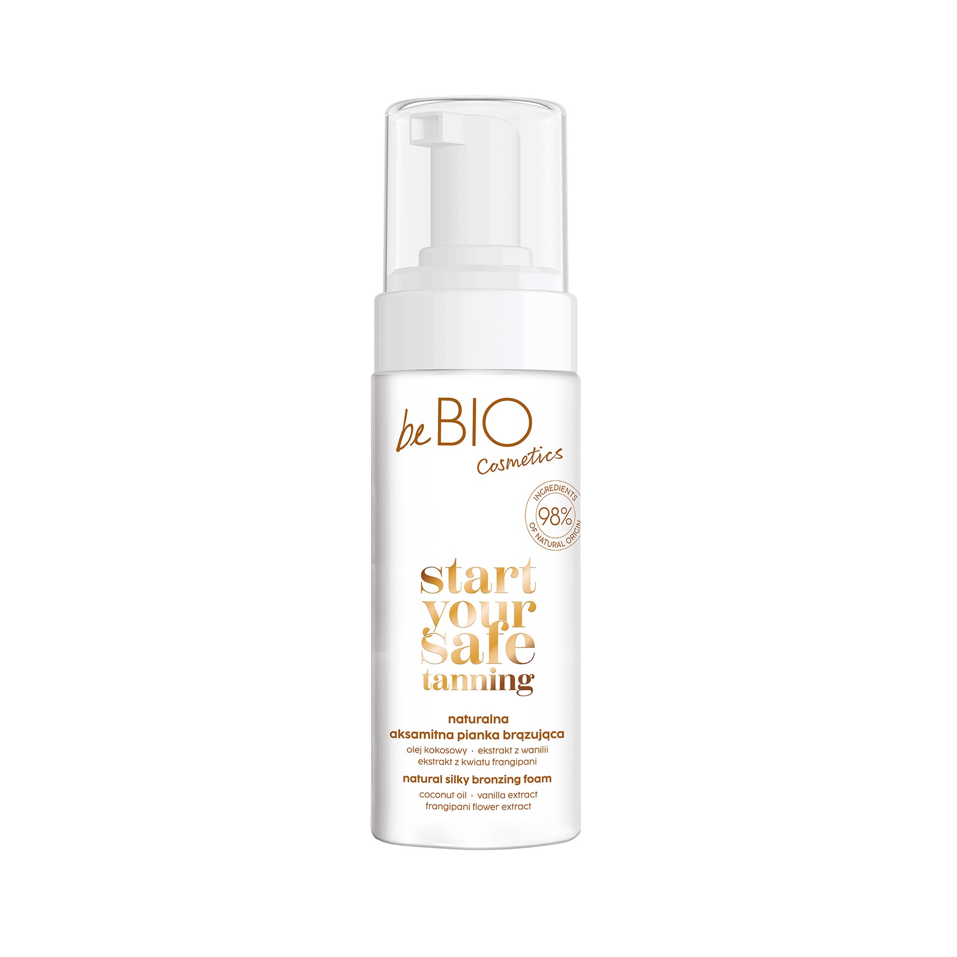 beBIO silky bronzing body foam contains as much as 98% ingredients of natural origin. Thanks to natural bronzing ingredients – erythrulose and DHA – it provides the effect of beautiful, golden and evenly tanned skin. Formula is enriched with caring ingredients: coconut oil, frangipani flower extract, tiare flower extract and vanilla extract that make the skin moisturized, nourished, smoothed and regenerated. Owing to its lightweight texture, the foam spreads very easily and does not leave smudges or stains.